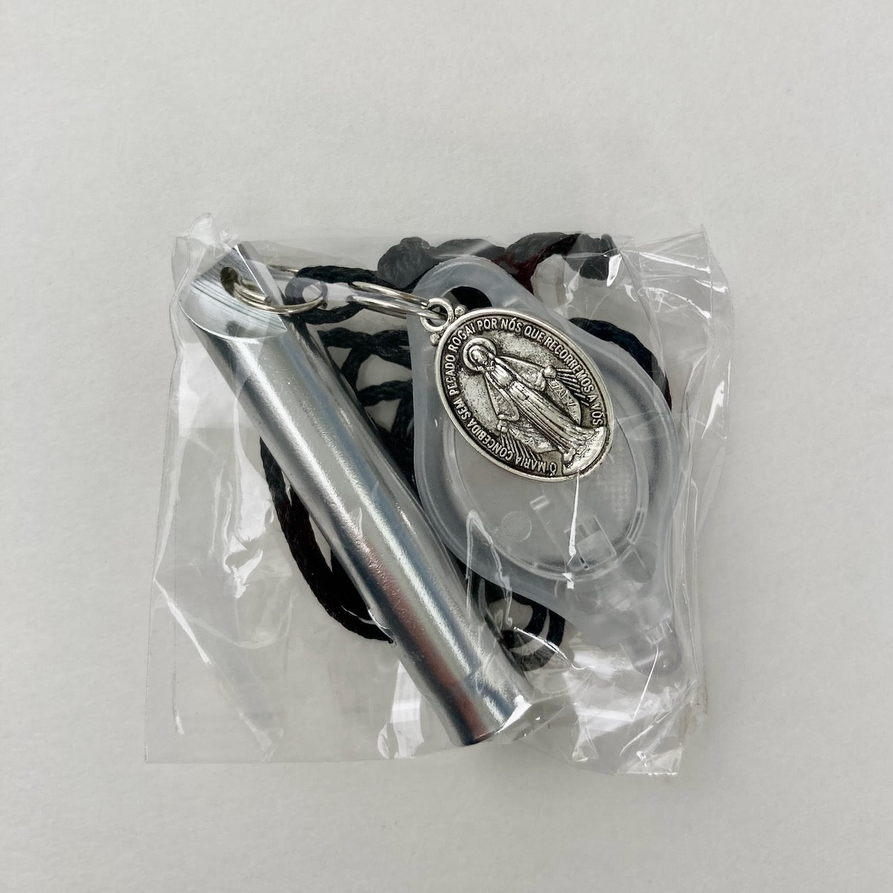 This multi-functional Safety Whistle Necklace blends practicality with meaningful design. It features a solid-colored whistle for clear, piercing sound in emergencies, a pinch-activated round LED flashlight that glows bright for up to 100 hours, and a Miraculous Medal charm—a Catholic symbol of faith and protection. A mini split ring allows additional charms or medals to be added, or the miraculous medal to be removed and used elsewhere. It also allows for replacement of the mini flashlight.